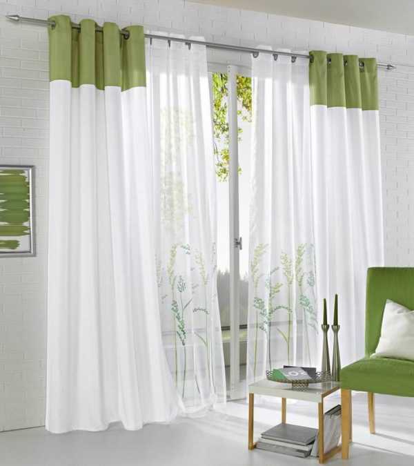 Элегантно обыграть сочетание кисеи и тюля одного цвета, можно повесив две нитяные шторы, одну в тон тюлю, а другую контрастной расцветки. Особенно выигрышно такая комбинация выглядит в черно-белом варианте.