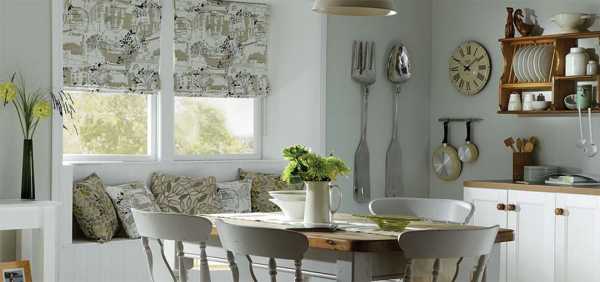 Стиль прованс для кухни или загородного дома предполагает занавески из натуральных тканей с вышивкой или набивным рисунком. Добавляя сюда римскую занавеску, нужно выбрать для нее ткань той же плотности, что и для комплекта штор, а цвет, как у тюля.