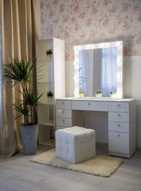 - зеркало. Этот атрибут является необходимым элементом каждого туалетного столика. Однако стол визажиста обязан включать в себя зеркало не меньше параметра 50х50. Большой размер гарантирует удобство своему владельцу, благодаря которому удастся рассмотреть, насколько красиво сочетаются, например, румяна с губной помадой, чего не получится увидеть в отражении маленьких зеркал;
