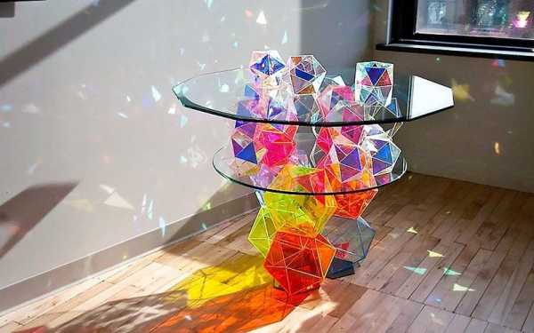 - Радуга. Под таким названием объединяются разные модели, выполненные из прозрачного и цветного стекла, которые за счет преломления подсвечивают окружающее пространство всеми цветами радуги. Модели отличаются цветом стекла, набором используемых фигур и формами столешниц, которые могут быть круглыми или многогранными.