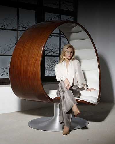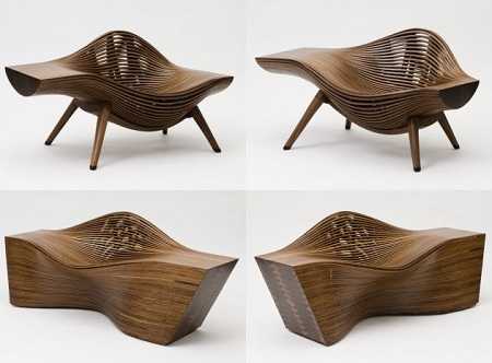 Интересное кресло из лакированного дерева. Представлено оно в виде полукруга, с мягким основанием для спины и для ног. Конечно, такой концепт уникален, но практичен ли он? Скорее всего, что нет, ведь если долгое время находиться в таком положении, то спина начнет затекать и уставать.