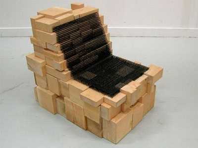 Креативный стул из деревянных «кирпичей», предоставили нам турецкие дизайнеры. Такой предмет интерьера отлично подойдет нестандартному, амбициозному человеку, который любит все креативное. Стул в интерьере является декором, хотя он очень удобный и практичный. Единственным минусом является то, что его спинка не ровная и не гладкая, из-за чего ее приходится застилать мягким.