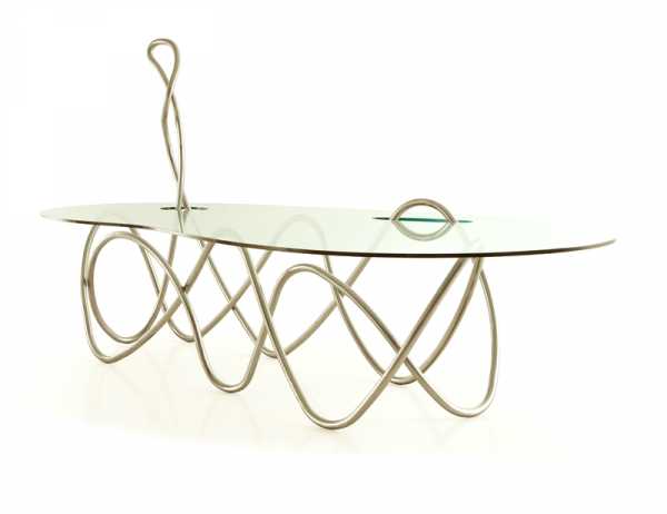 Искусный дизайнер Джакопо Фроджини создал интересный вариант обеденного стола. Основание выполнено в виде двух изогнутых полых трубок из нержавеющей шлифованной вручную стали. Одна фигурная конструкция ”рамка” поддерживает овальный топ из прозрачного стекла толщиною 15 мм. А другая предназначена для украшения изделия: её детали проходят через специальные прорези-”петли” столешницы.