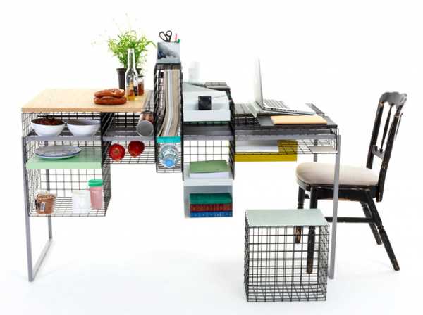 В конструкции как таковой столешницы нет, вместо нее используется набор сетчатых контейнеров трёх размеров — А3, А4, А5 — которые хозяин стола расставляет в любом порядке, создавая для себя удобный дизайн.