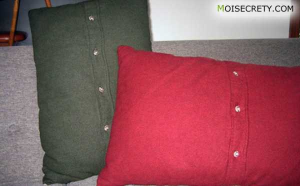 1. Очень легко и красиво можно украсить диванные подушки пуговицами. Дайте волю фантазии! Пришивайте яркие и сочные пуговки на светлую ткань или пастельные и бежевые на темную наволочку. Пуговицами можно выложить имена, рамочки, надписи и даже картинки, например, смайлики, сердечки, цветочки, деревья и многое другое. “Заверните” подушку в одежду, застегнутую на пуговицы. Смотрится это очень оригинально и эффектно! Вот, например, так: