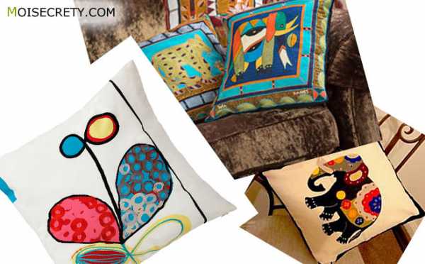 - Подушки с вышивкой — вершина мастерства швеи. Это очень красивый, но очень трудоёмкий вариант декоративной подушки, требующий высокого мастерства от изготовителя. Вышивка делается в ручную на подушке или на наволочке. Украсить такой подушкой можно любое помещение.