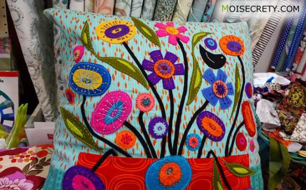 - Подушки с аппликацией — один из самых популярных видов декоративной подушки. Изготавливается способом нашивки на подушку или наволочку, вырезанных из другой ткани аппликаций. Этот вид подушек очень хорошо подходит для начинающих швей. Использовать подушки с аппликацией можно в любой комнате в зависимости от тематики.