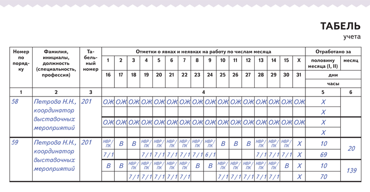 Образец заполнения табеля учета рабочего времени