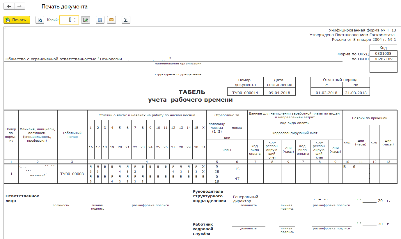 Нужно помнить, что руководителю этого отдела (даже если заполнять табель — не входит в его или ее обязанности) следует расписаться на заполненной форме.