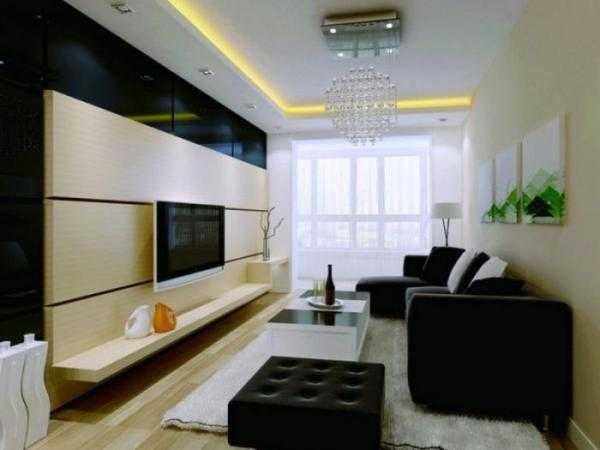 Мебель устанавливается возле длинных стен. При этом она максимально узкая. Уместно использовать ковер с полосами, параллельными коротким стенам. Это позволяет зрительно увеличить пространство.