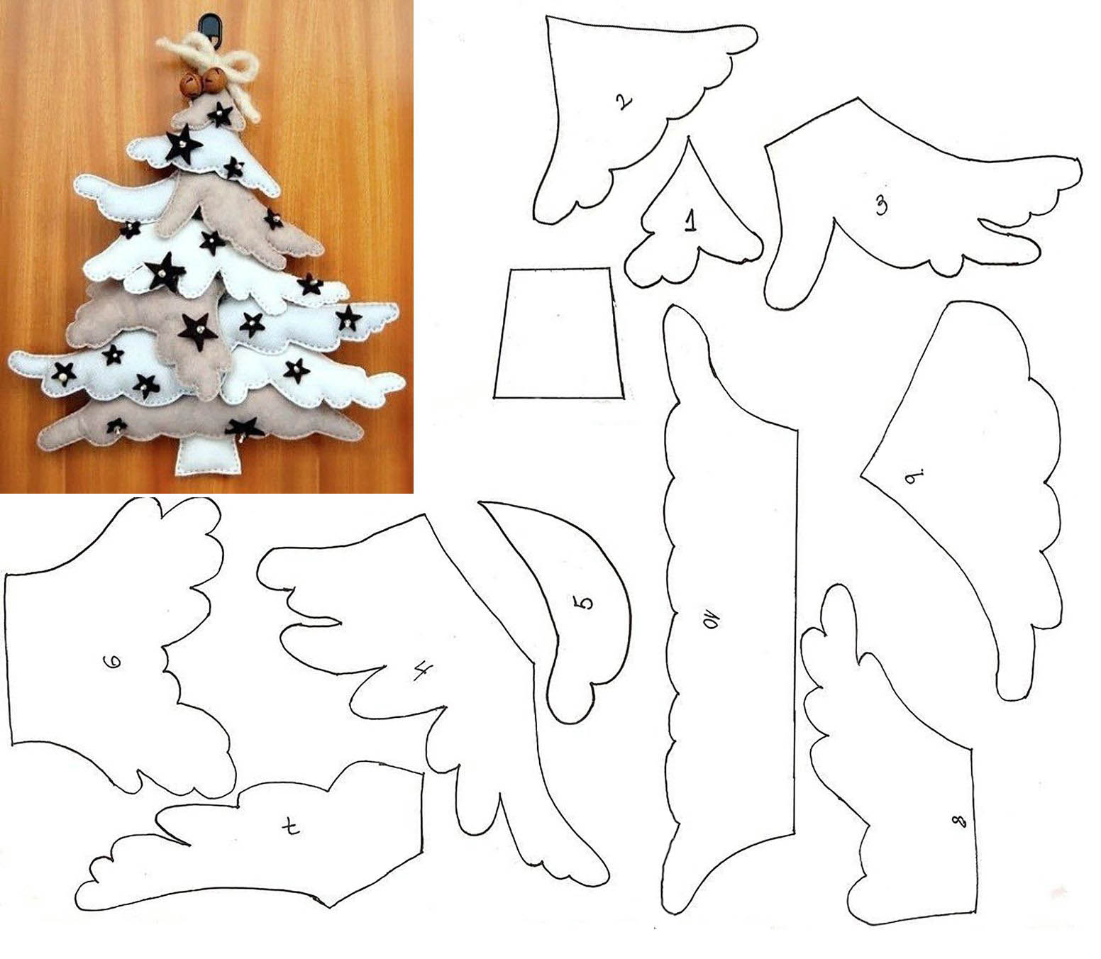Используя выкройки ниже можно сделать маленькие игрушки, чтобы украсить новогоднее дерево. Или используя большую выкройку порадовать близких елочкой на стену.