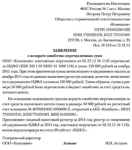 Образец заявления на возврат ндфл в 2019 году в организацию