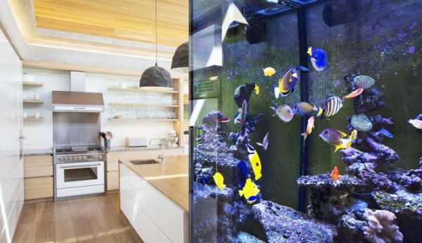 Аквариум на кухне – прекрасная возможность обыграть помещение.