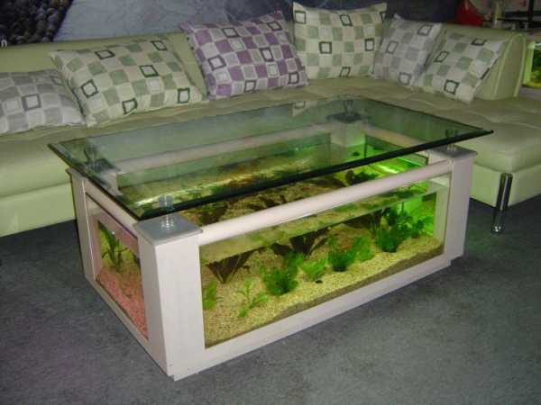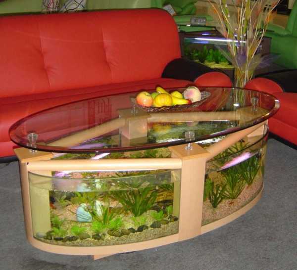 В журнальном столе прямоугольной формы красиво будет выглядеть аквариум со светлой естественной подсветкой. В аквариумах, вмонтированных в мебель, стенки делают из противоударного стекла.