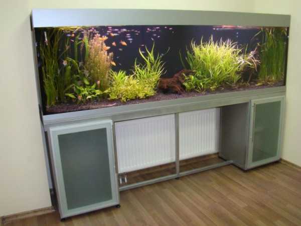 Это наиболее простые и одновременно надежные конструкции, что обусловило их популярность. Подобные изделия представляют собой емкость на подставке, выполненной в виде тумбы. Последняя может использоваться для хранения принадлежностей, требуемых при уходе за рыбками, и корма. Более простой вариант напольного аквариума – конструкция, выполненная из металлических уголков, которые внизу играют роль ножек: сама емкость располагается на сварных перекладинах сверху. Высота таких систем находится в пределах 0,5-1,5 м, ширина обычно не превышает полуметра, длина зависит от ваших предпочтений.