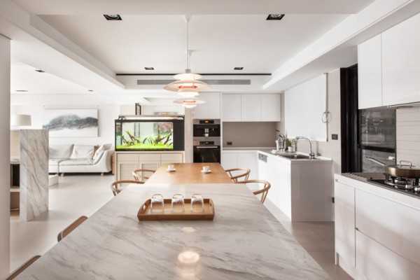 Прямоугольный аквариум с золотыми рыбками на следующем фото также является составной частью рабочего кухонного стола, расположенного в самом центре современной кухонной зоны с открытым планированием. Стильная кухня не имеет смежных стен и перегородок, плавно переходя в гостиную и просторную столовую.