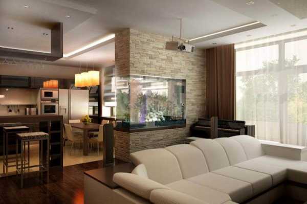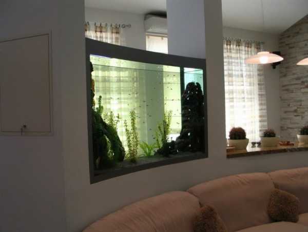 Это прекрасный вариант для зонирования пространства. Аквариум придаст комнате уникальный внешний вид. Он смотрится стильно и изящно. Экземпляр может быть сухим или наполненный водой, в которой будут жить разные рыбы и растения. Если не хочется постоянно ухаживать за живыми организма, то можно установить модель, которая будет выполнять только декоративную функцию.