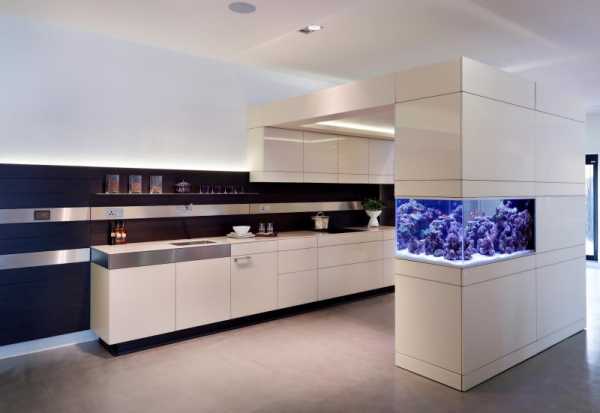 Аквариум отлично впишется также в интерьер кухонной зоны. На сегодняшний день многие дизайнерские компании выпускают целые серии эксклюзивной мебели (кухонной в том числе) со встроенными аквариумами.