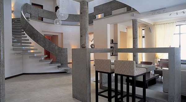 Помимо кухни, барная стойка, выполненная из бетона, может быть размещена и в квартире-студии. Обустройство такого элемента мебели является отличным приемом зонирования пространства.