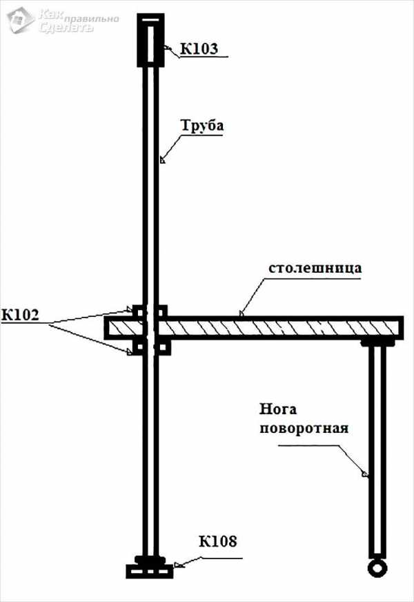Изготавливаем чертеж, беря во внимание, что максимальная высота стойки – 1,1 или 1,2 м, ширина столешницы варьируется в пределах от 30 см до 60 см (в зависимости от этого определяемся с размерами основания).