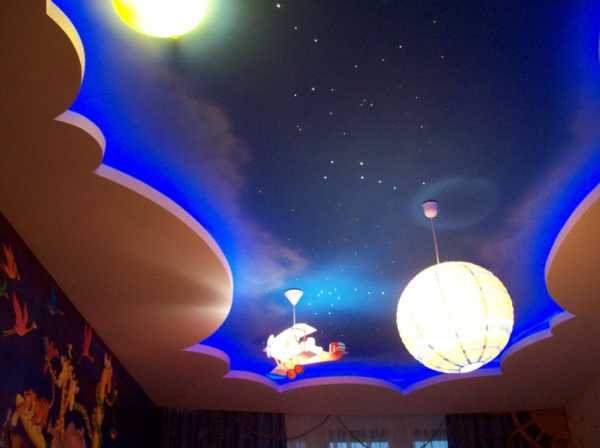- возможность зонировать пространство комнаты, сделать отдельное рабочее место в гостиной, или отделить кухню от гостиной цветом, фактурой. Модели потолка, предлагаемые дизайнерами, могут быть самыми разнообразными – звездное небо или волны;