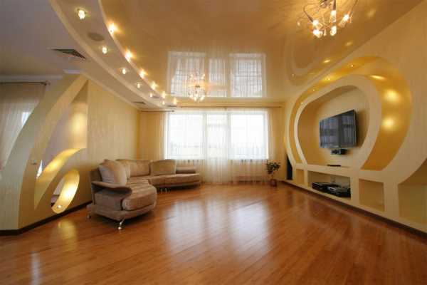 Фото из интернета демонстрируют возможность установки конструкции во всех комнатах квартиры или дома. Чтобы иметь возможность зонировать пространство можно воспользоваться одно и двухуровневыми натяжными потолками. Блестящая глянцевая поверхность или, созданная искусственно зеркальная, визуально расширят пространство, с правильно подобранной подсветка можно акценты на нужных зонах комнаты. Двухуровневая конструкция популярна среди населения, это оригинально и необычно, дает возможность использовать в одной модели несколько фактур и встроить освещение по желанию заказчика. Разные виды многоуровневых потолков в гостиной такого плана могут быть установлены в сочетании с гипсокартоном.