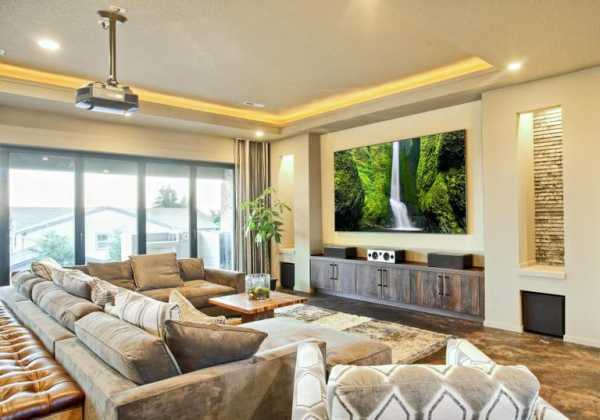 Скрытая подсветка под нижним уровнем — превосходный дизайнерский прием, который подойдет как маленьким, так и просторным залам. Она помогает создать эффект парящего потолка (дополните ее светодиодными лентами по периметру, чтобы усилить его) и просто очень красиво смотрится.