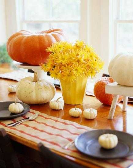 Поставьте на стол большой букет из веток с листьями, тыквы. Подвесьте тыквы под потолок