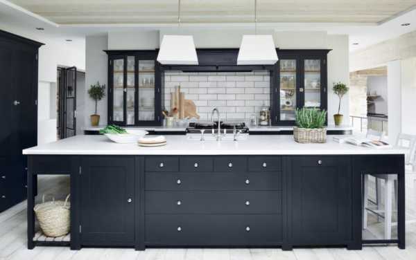 Отличный вариант для большой кухни, при котором мебель гарнитура располагается вдоль стен буквой «Г» или «П», а в середине имеется дополнительный модуль – «остров». В него можно вмонтировать мойку, варочную поверхность и духовой шкаф или оставить свободной столешницей для готовки и приема пищи. Не следует забывать, что расстояние между тумбами и шкафами вокруг «острова» должно быть достаточным для комфортного движения и пользования шкафами и ящиками.