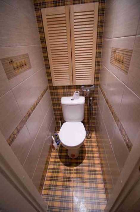 На фото отделка стен и пола плиткой большого размера, шкаф встроен в стену и не выступает над унитазом для экономии пространства.