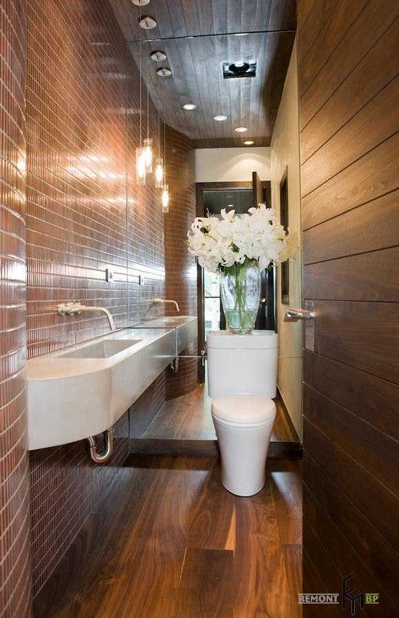 Ламинат можно крепить на клей прямо к стене, тогда пространства будет скрадываться не больше, чем от укладки плитки. Ламинатом можно отделать одну стену, часть или полностью сделать деревянный интерьер маленького туалета, но тогда нужно подбирать разные цвета дерева для пола и стен.