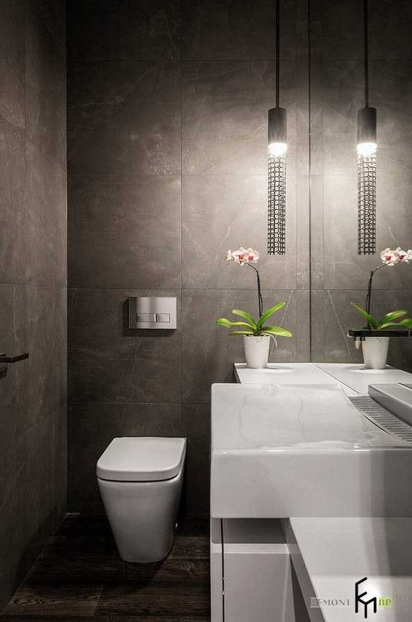 Темно-серые стены санузла стали контрастным дополнением к белоснежному полу и потолку, оригинальные предметы декора и освещения дополнили минималистскую атмосферу.