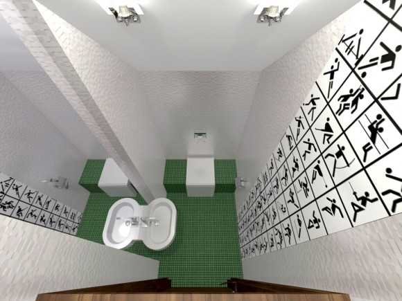 Еще один пример использования комбинаторики белых и цветных поверхностей в туалетной комнате. Благодаря необычным декоративным элементам, удалось создать действительно нетривиальный дизайн помещения.