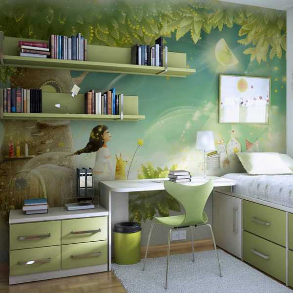 Прекрасно подходить для детской комнаты зеленый цвет, который действует успокаивающе на психику ребенка, помогает концентрации внимания.