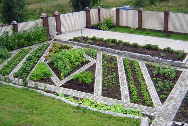 Удобны, как оказалось, посадки в модули – небольшие, обычно правильной геометрической формы, обрамленные тротуарным покрытием почвенные карманы. Это удачное решение, дающее возможность объединить дорожки и огород. Получится, собственно, не огород, а декоративная мозаика из цветущих и зеленеющих фигур (квадратов, прямоугольников, шестиугольников, ромбов и т. д.) с растениями, за которыми легко ухаживать.
