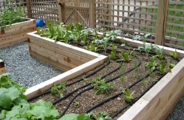 Магия сборных грядок подобного типа в том, что можно заранее заготовить по шаблону доски, а затем, на месте, просто собрать за считанные минуты. Дополнительно на фото показана возможность создания системы автополива.