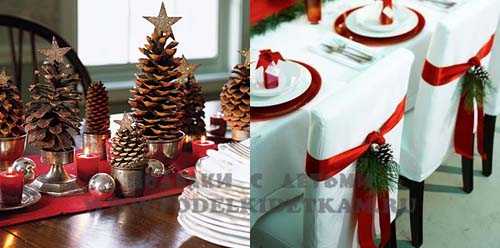 Такой декор праздничного стола или комнаты подойдет на праздники, когда все собираются дома за новогодним столом, ждут когда пробьют куранты и торжественно взрослые выпивают по бокалу шампанского. Дети же в это время могут или спать или принимать участие в праздновании Нового года играя детскими поделками из шишек.