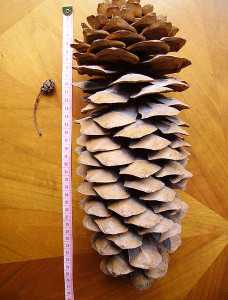 На левом фото ниже — маленькая шишка секвойи вечнозеленой и большая — сосны Ламберта, на правом — ольхи.