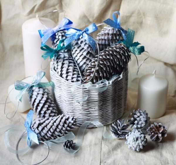 Самым элементарным вариантом является оформление шишек в виде подвесок. Для этого используется только атласная лента, продетая через «лепестки» шишек.