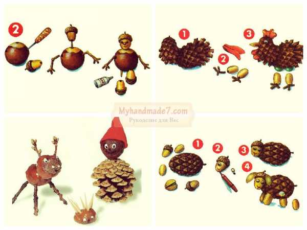 Эти поделки можно сделать из сосновых шишек. Заранее соберите их и желуди. Желуди просушите, а шишки обработайте теплым столярным клеем, чтобы они не изменили свою форму, когда высохнут. Возьмите будущее тело и переверните его широким концом вверх. Сделайте шею из маленького кусочка пластилина и прикрепите ее в верхней части поделки. А к шее прикрепите перевернутый желудь – он послужит головой вашей игрушке. Можно сделать своими руками волосы. Для этого нарежьте ниток подходящего цвета и при помощи пластилина прилепите их к голове. Чтобы не было видно места прикрепления, наденьте «шапочку» — крышку желудя. Сделайте руки и ноги при помощи веточек, которые будут крепится к телу с помощью пластилина, а на концах у них будут перевернутые шапочки желудей. И последний штрих – глаза. Приклейте бусинки на их место, или слепите их из пластилина.