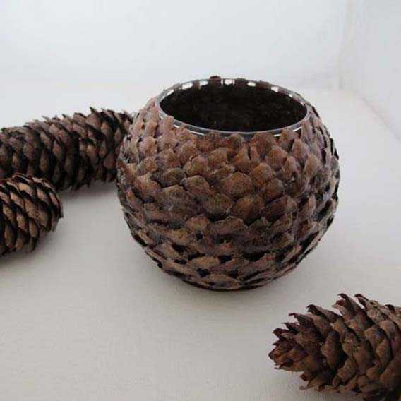 Затем по периметру окружности приклеиваются шишечные лепестки, оставляя равные промежутки. Второй рад укладывается по такому же принципу, но только на промежутки первого ряда. Такую операцию нужно проделать до тех пор, пока вы не получите высоту, которую вы хотите. Главное чтобы банка со свечой была не заметной.
