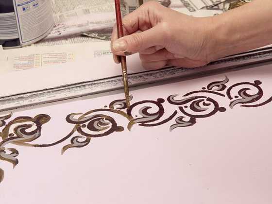 - Повторяющийся рисунок наносится без спешки. Сначала надо дать просохнуть одному элементу, затем наносить новый. При необходимости можно использовать те же трафареты для декора дверей, мебели.