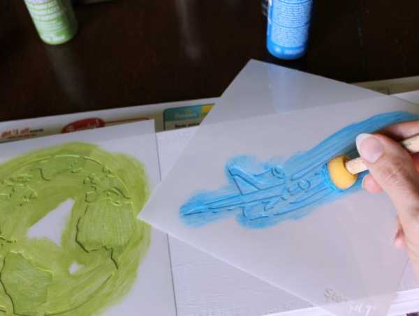 Промакивающими движениями без сильного нажима аккуратно нанести краску в прорезях шаблона, начиная от центра каждого отверстия. По мере продвижения к краям на губке будет оставаться все меньше краски, и она не затечет под пленку шаблона. Чтобы края получились четкими, можно пачкать краской край шаблона, захватывая его. Ничего страшного не произойдет, так как через пластик краска проникнуть не сможет. Закончив обработку шаблона, его нужно осторожно снять, стараясь не сдвинуть и не размазать свежую краску. Если это все-таки произошло, то убрать помарку влажной тряпочкой.