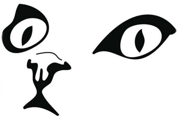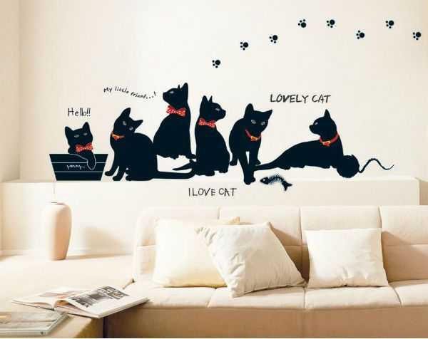 Трафарет кошки для декора стен можно сделать в виде силуэта, вырезав фигурку без внутренних деталей. После окраски получится «тень» животного или нескольких, если добавить другие фигуры. В силуэтной технике можно удачно сочетать трафарет и антитрафарет, создавая красивые картины из жизни изящных зверей.