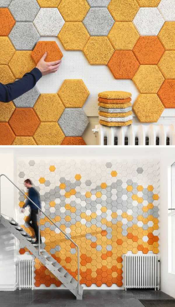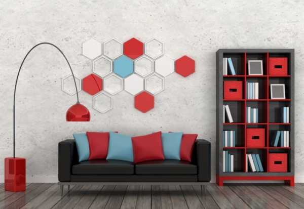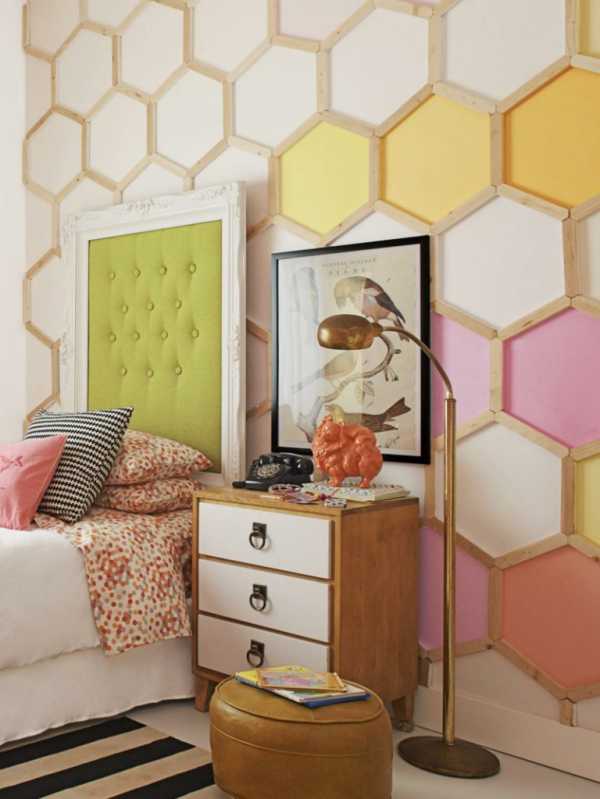 Небольшие деревянные палочки позволяют создавать интересные узоры, будь то квадраты, трапеции или, как на фото выше, соты. Разноцветный фон отдельных сот делает стену вполне самостоятельным аксессуаром, украшающим интерьер комнаты, а в зависимости от выбранной цветовой гаммы он может создать совершенно разное настроение в помещении. Вообще, гексагон — очень интересная форма, и дальше вы найдете еще несколько идей декора стен гексагонами.