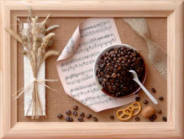 Сначала стоит приклеить кофейные зернышки в любом порядке, какой вы захотите. Затем раскрасьте свободные части краской и, не дождавшись высыхания, посыпьте блестками.