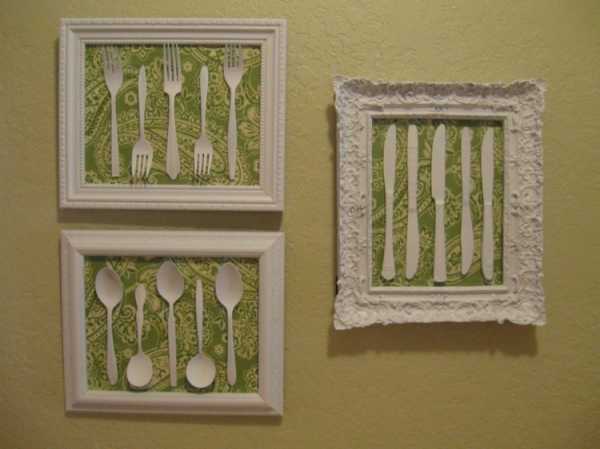 Столовые приборы и различные кухонные аксессуары, которые уже не применяются в рабочих процессах, можно использовать для составления оригинальных композиций. Украсить преображенными предметами обихода можно кухню, столовую, веранду загородного дома и даже гостиную, оформленную в стиле кантри или шебби шик.