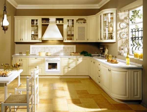 В качестве покрытий для пола кухни в стиле классика рекомендуется использовать натуральные материалы, такие как дерево или камень. Это может быть специальный влагоустойчивый ламинат или керамическая плитка больших размеров. Лаконично смотреться в стиле классической кухни будет некая неровность или искусственная состаренность этих материалов. Цвет лучше выбрать темно-коричневый, шоколадный, коньячный или светло-бежевый.