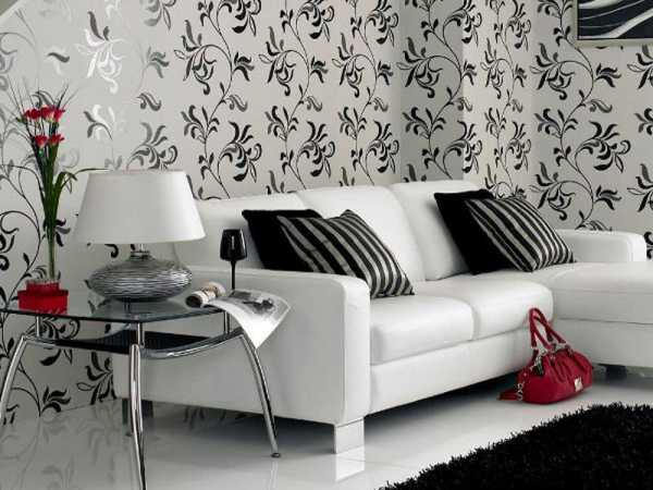 Цветочные обои в интерьере гостиной, используемые на фото ниже, выглядят очень художественно и со вкусом. Красные цветы в сочетании с серовато-черными листьями создают визуальное наслаждение для глаз. Данные обои хорошо смотрятся на фоне белого дивана и белоснежной люстры.