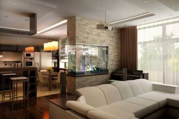 Еще одна интересная и необычная идея. Если в доме любят живые цветы, можно разделить помещения ограждением из горшков с живыми цветами. Можно установить на стыке комнат – большой аквариум как это представлено на фото.